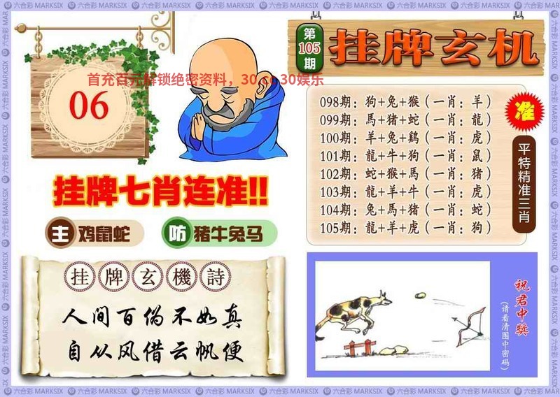 105期:单(猪兔蛇鸡)双(龙鼠马猴)狗44错 |